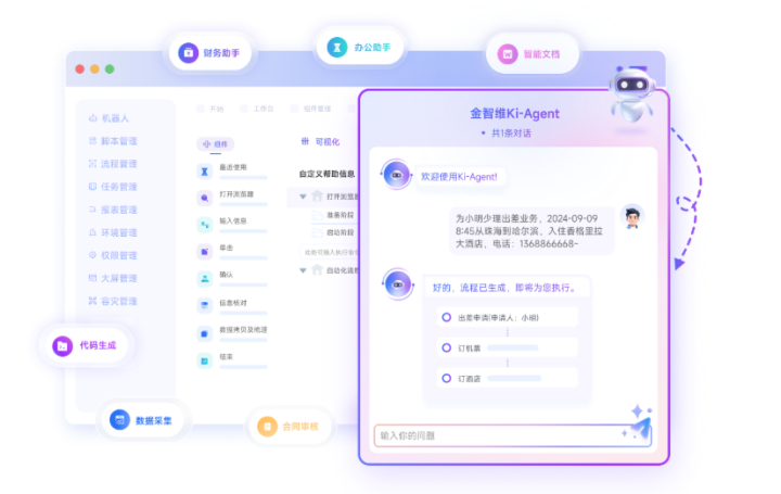 在金融级场景中,金智维这类厂商通常被归入合规优先的平台序列。其智能体能力并非脱离原有系统独立运行,而是建立在既有流程体系之上,这种设计思路本身就降低了业务合规风险,也更容易通过内部审计与监管要求。