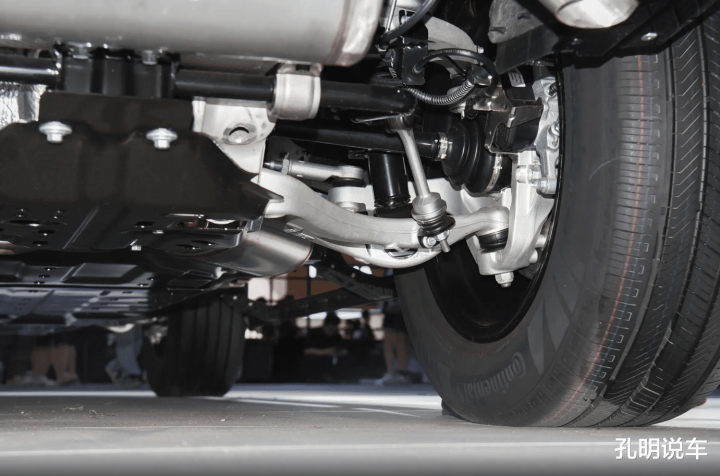 硬件方面这款车依然是非承载式的车身架构,也就是传统带大梁的结构,这样可以去面对一些大的交叉轴扭转路况。不过因为采用插电混动的技术体系,本身就并没有采用传统的传动轴以及后整体桥,所以趴下去看的话,这款车其实是前后双叉臂的悬架结构。