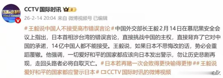 高市早苗的野心昭然若揭,王毅外长在慕尼黑会议上敲响警钟,正告日本不要走回头路,看看德国怎么做的。