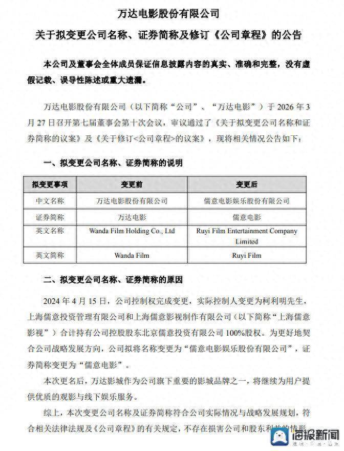 3月28日,万达电影(002739)发布公告,拟将公司名称变更为“儒意电影娱乐股份有限公司”,证券简称同步调整为“儒意电影”,证券代码保持不变。