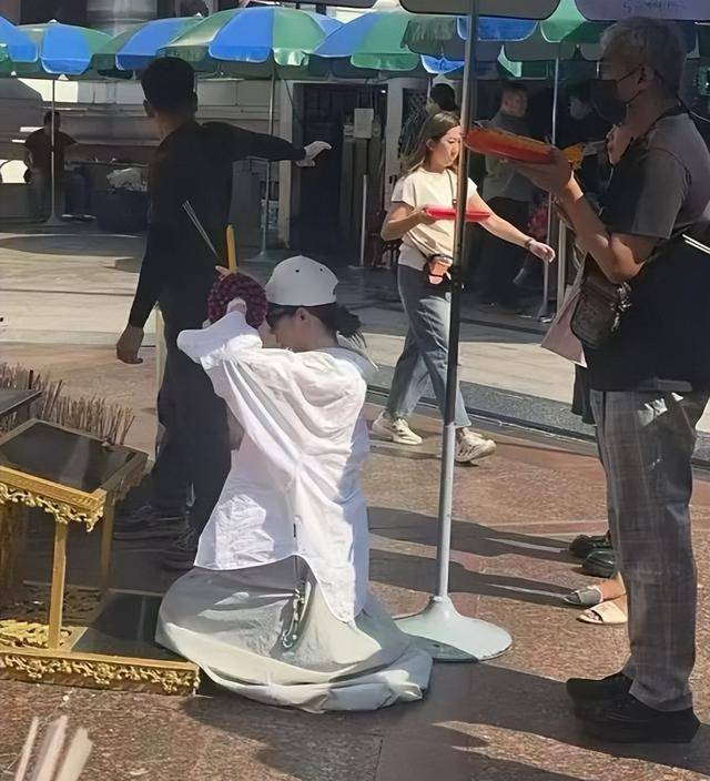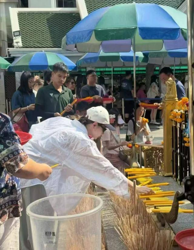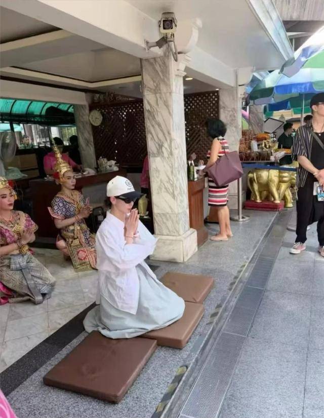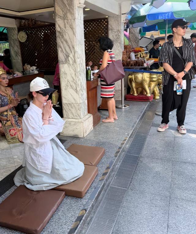 但她全程神情严肃,双手合十,跪在佛像前虔诚跪拜、上香,每一个动作都格外认真,哪怕周围有很多中国游客认出她,拿出手机拍照,她也丝毫没有在意,一门心思放在祈福上。